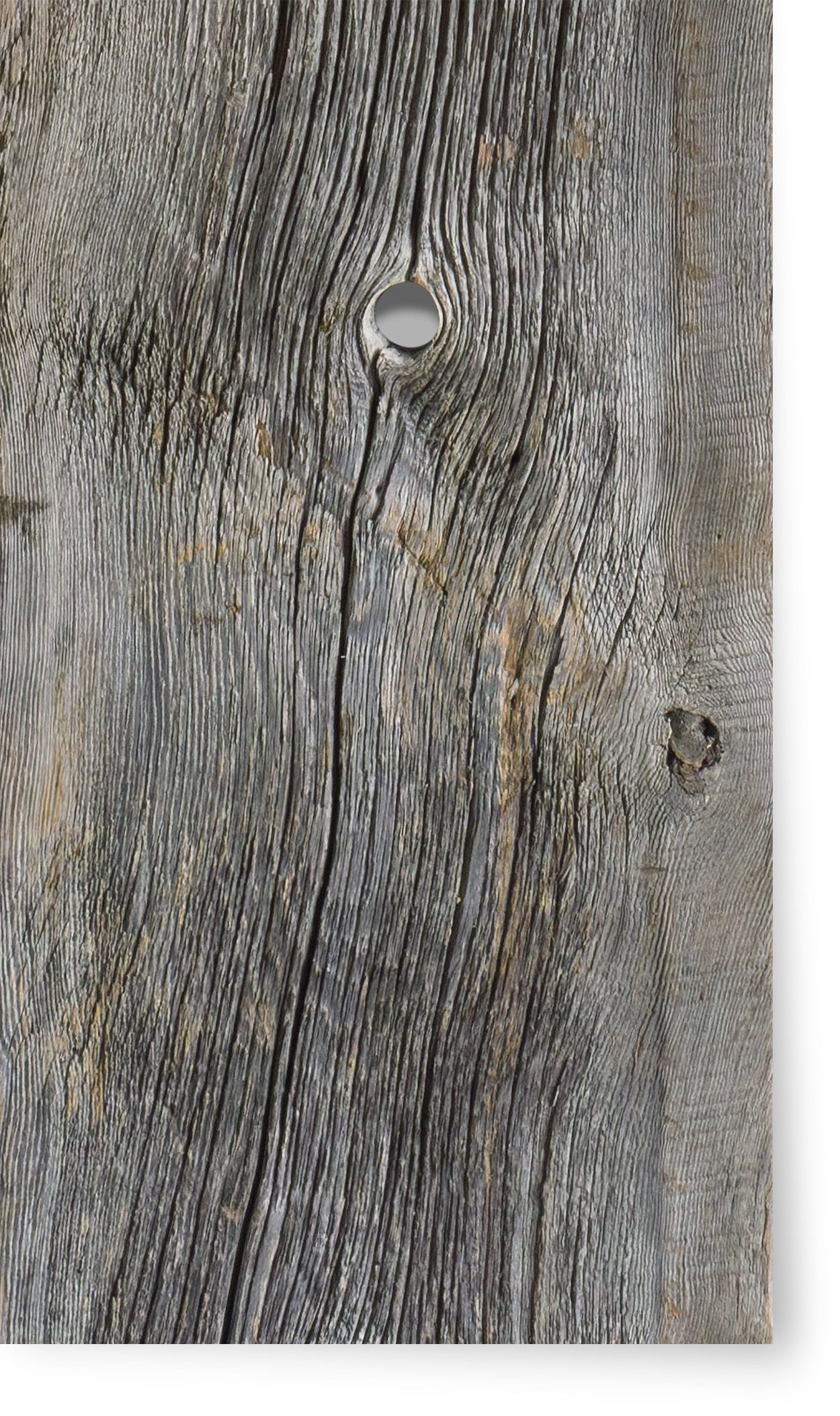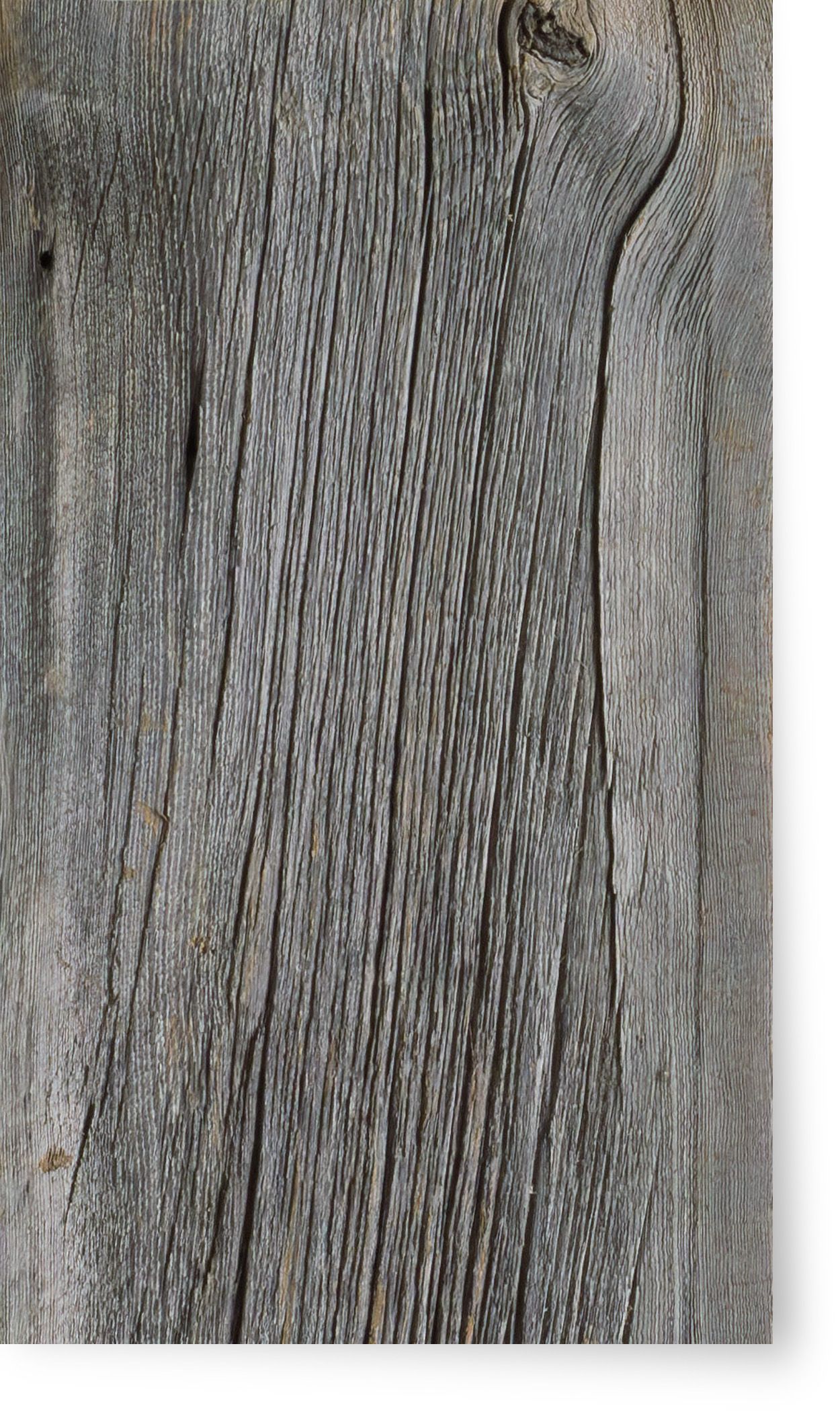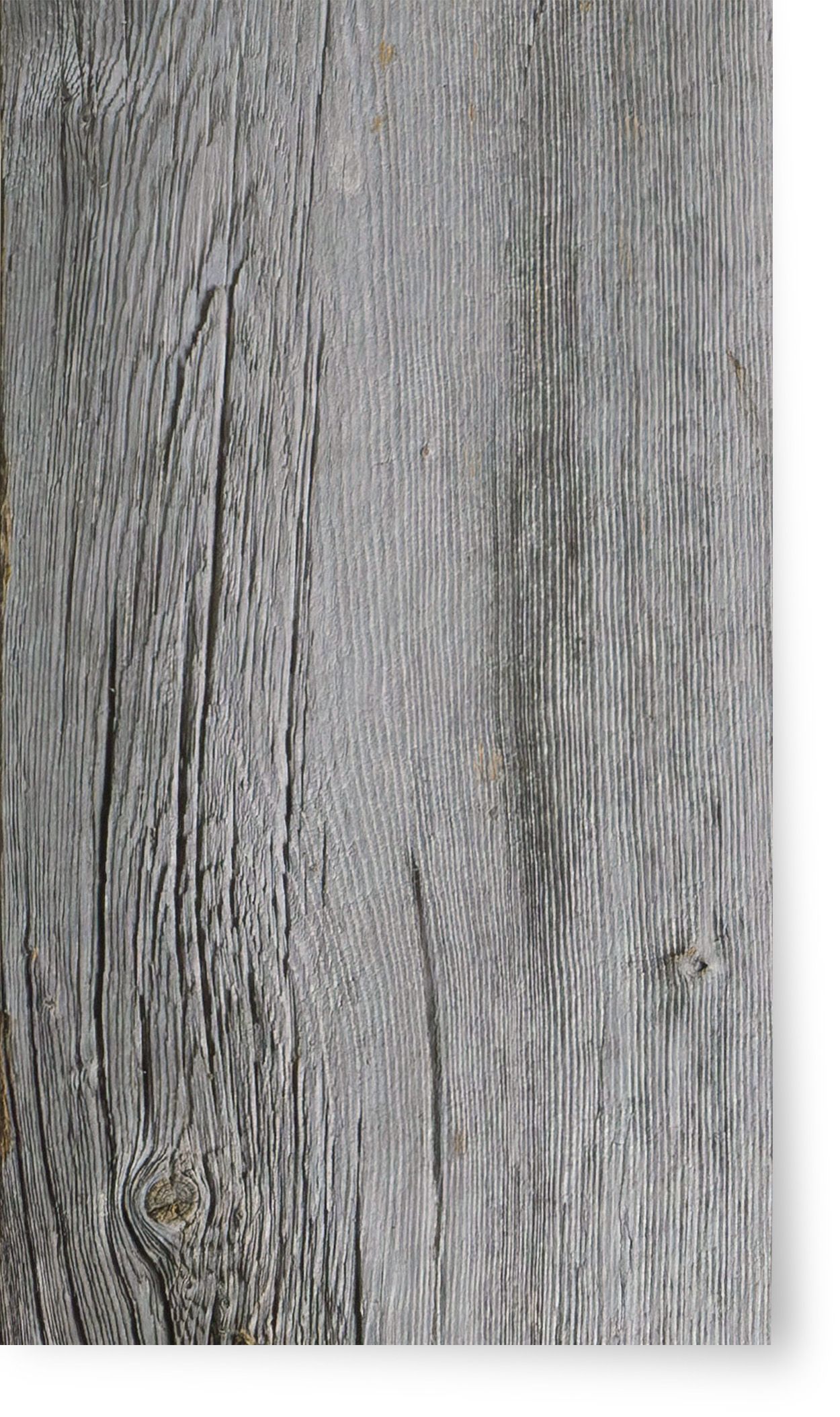 A mix of hard and softwoods that was used for exterior Barn sidings. Weathered through decades of exposure to rain, snow and sun, the wood has become groovy with colour variation between silvergrey and anthracite grey.