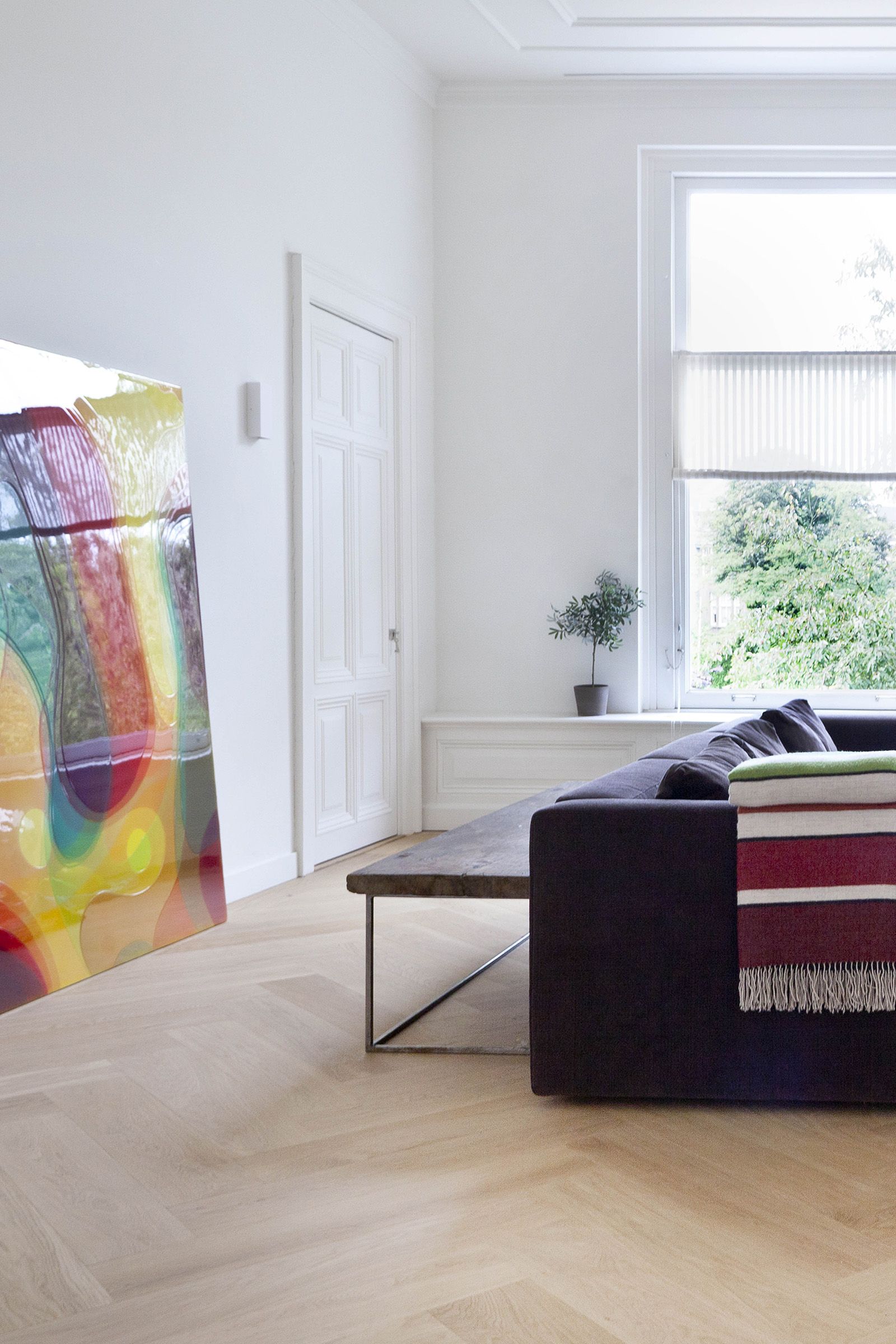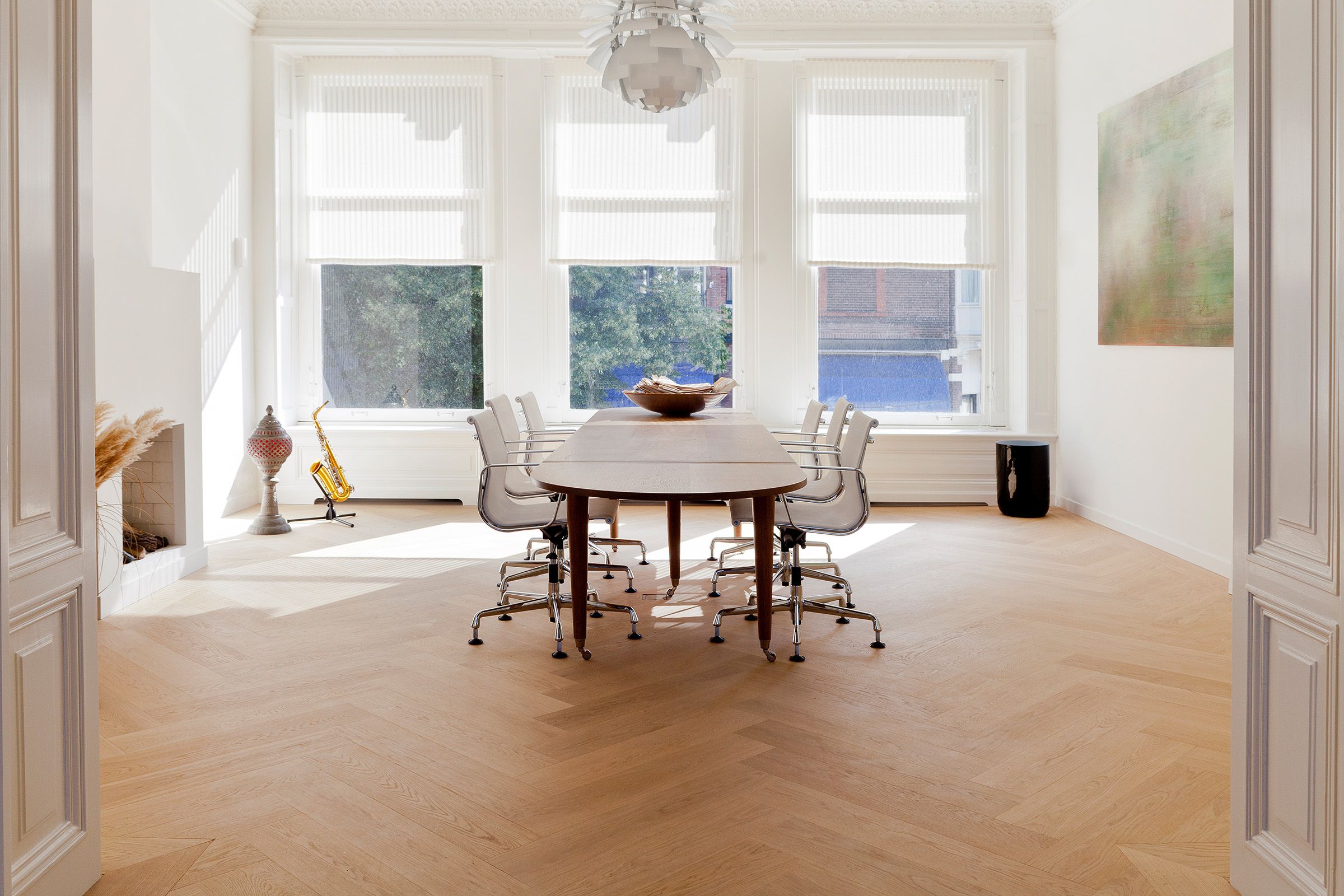 In the heart of Amsterdam, this private residence doubles as a refined home office, blending traditional elegance with modern design. The interiors emphasize clean lines and a sophisticated atmosphere, with the flooring playing a key role.