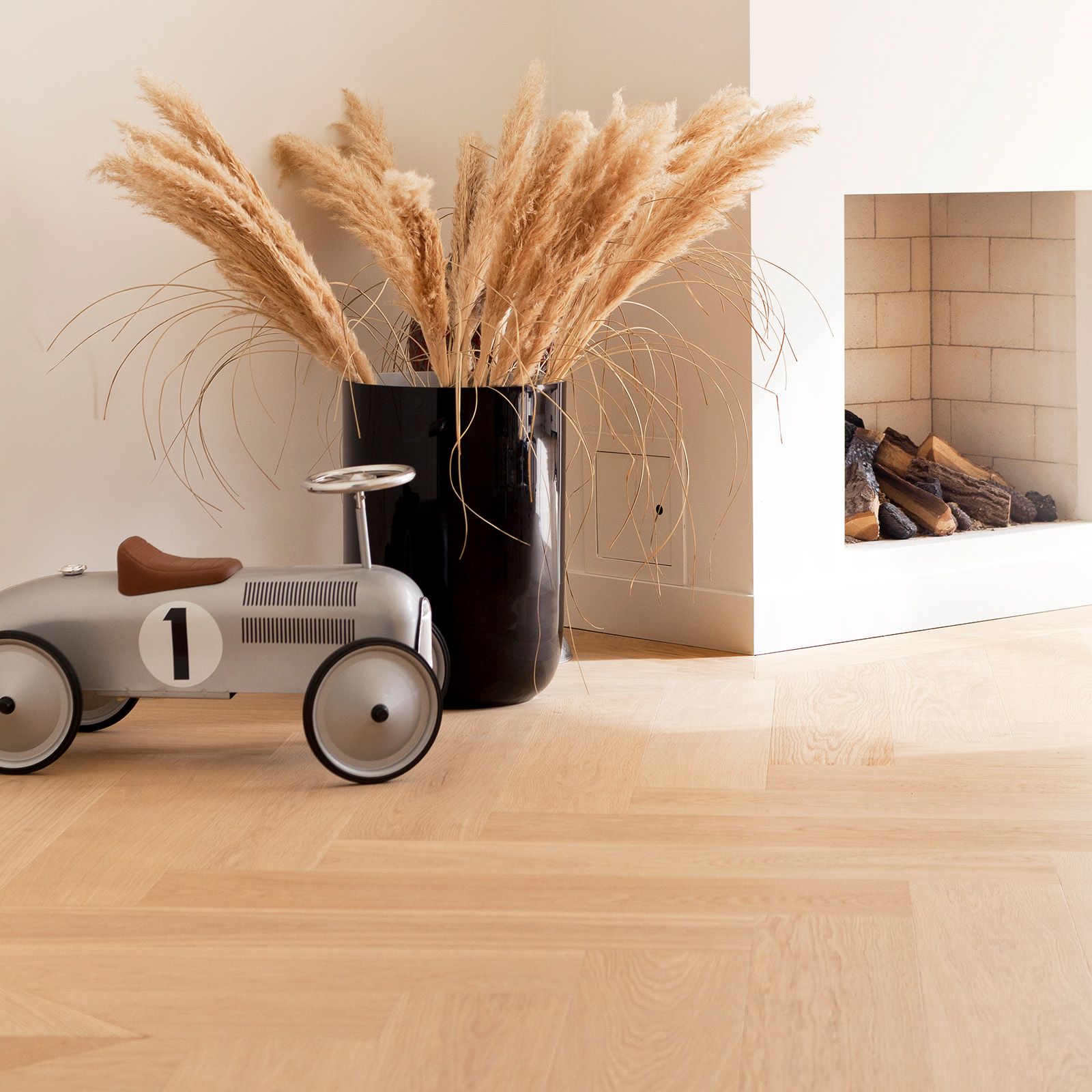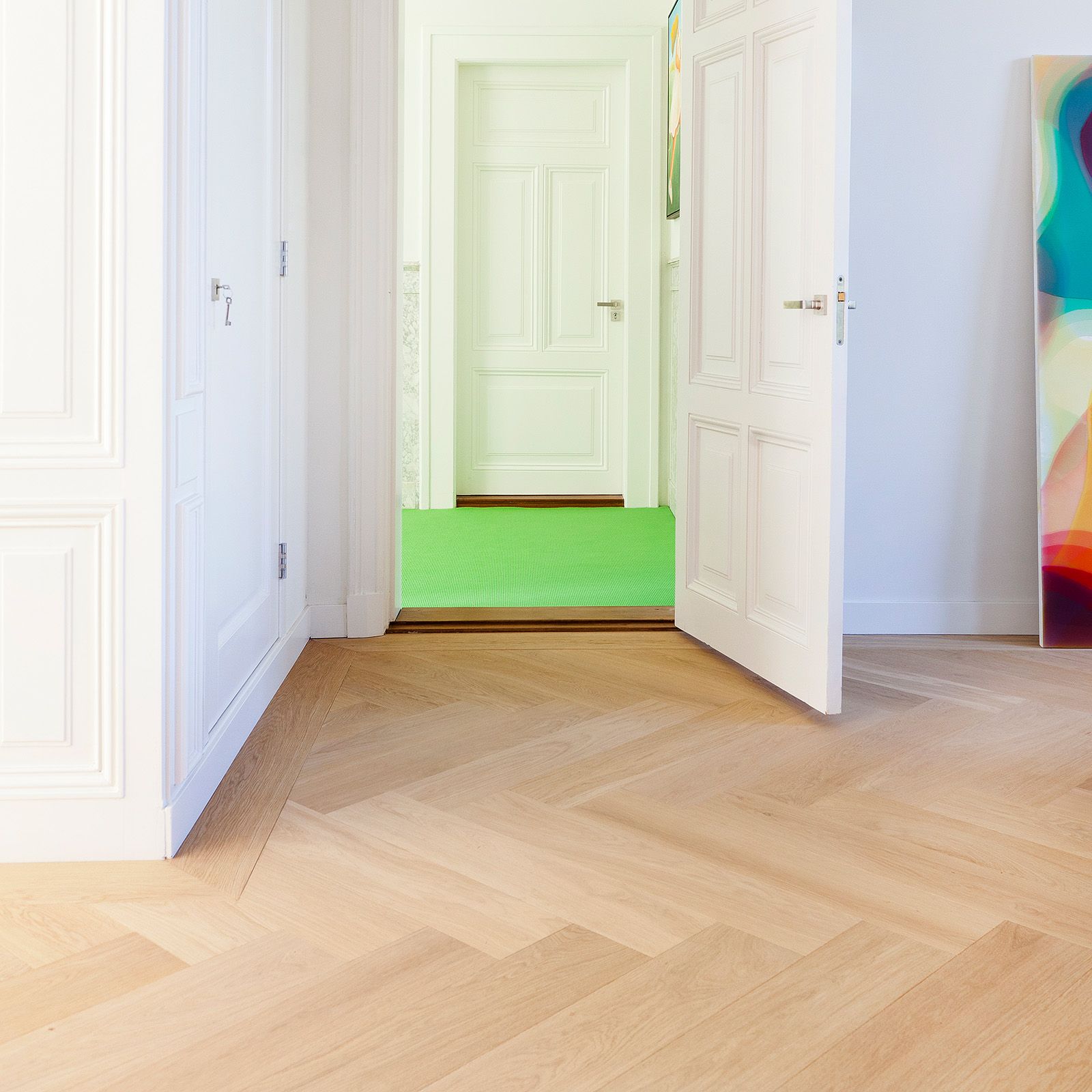 A large herringbone pattern in engineered Continental Oak anchors the space. The Faded Ultramatt Poly finish on the Oak planks adds a soft, natural glow, enhancing the bright ambiance and harmonizing with the muted color palette, striking a balance between contemporary and classic.
