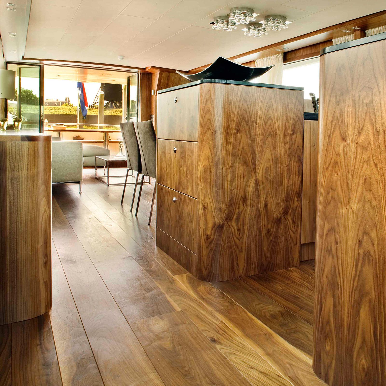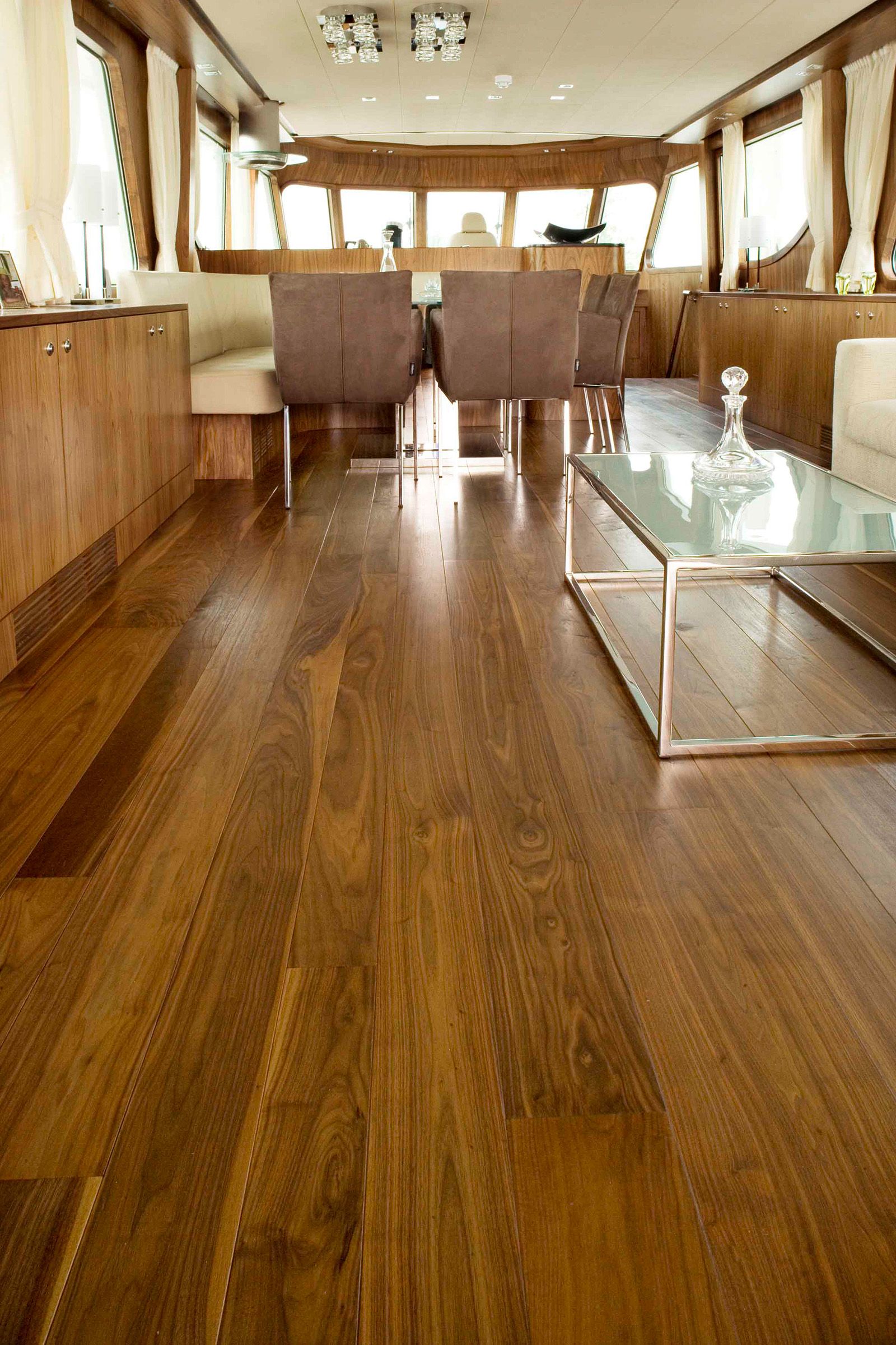 In the main living area, the walnut floor extends seamlessly across the open layout, enhancing the yacht's spaciousness. The Tung Oil Hardwax finish provides a soft sheen, ensuring durability and a refined appearance.
