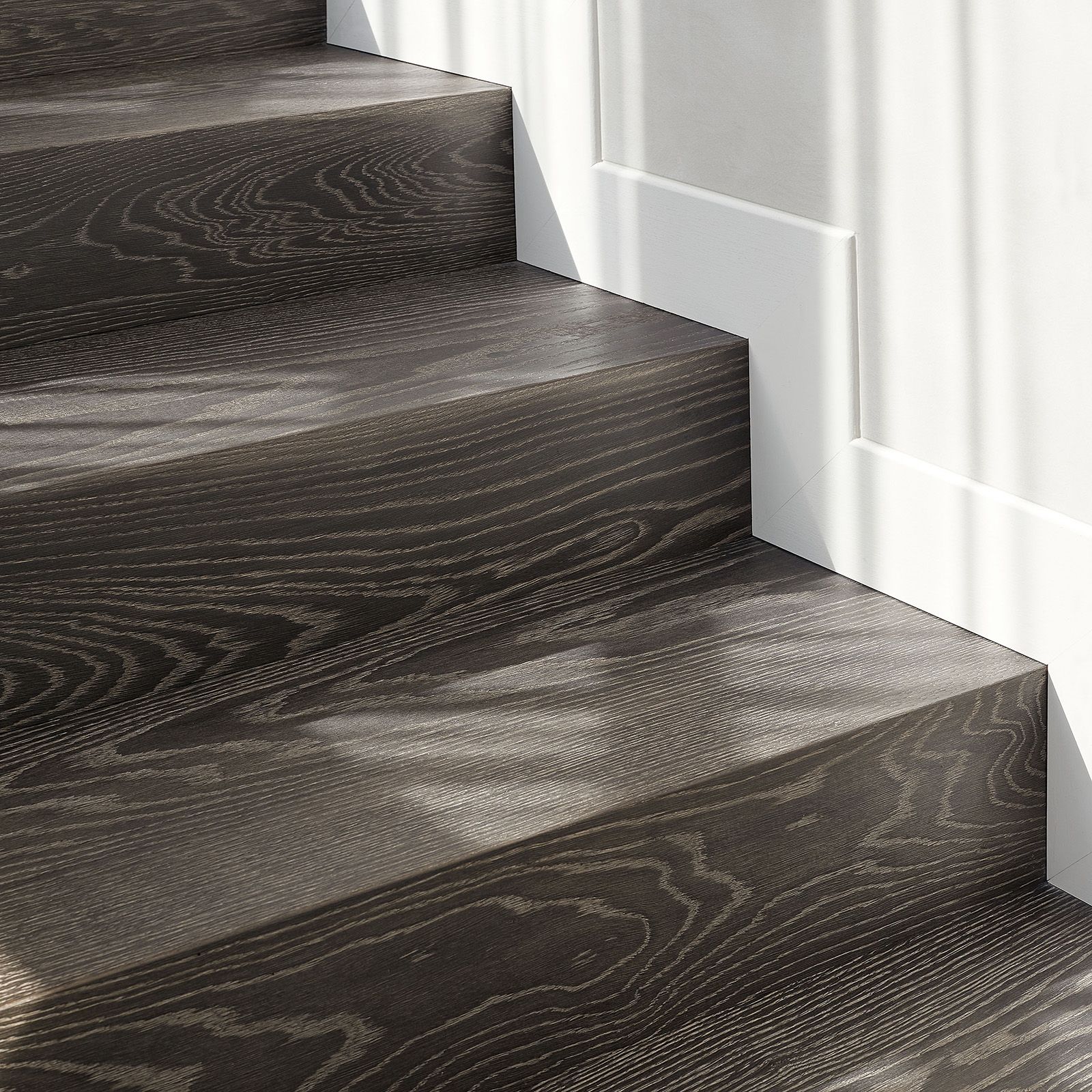 The staircase is finished in the same planks, with the grain running smoothly across both steps and risers. This detail gives the stairs a solid, consistent feel and connects the upper and lower levels as part of the same design language.