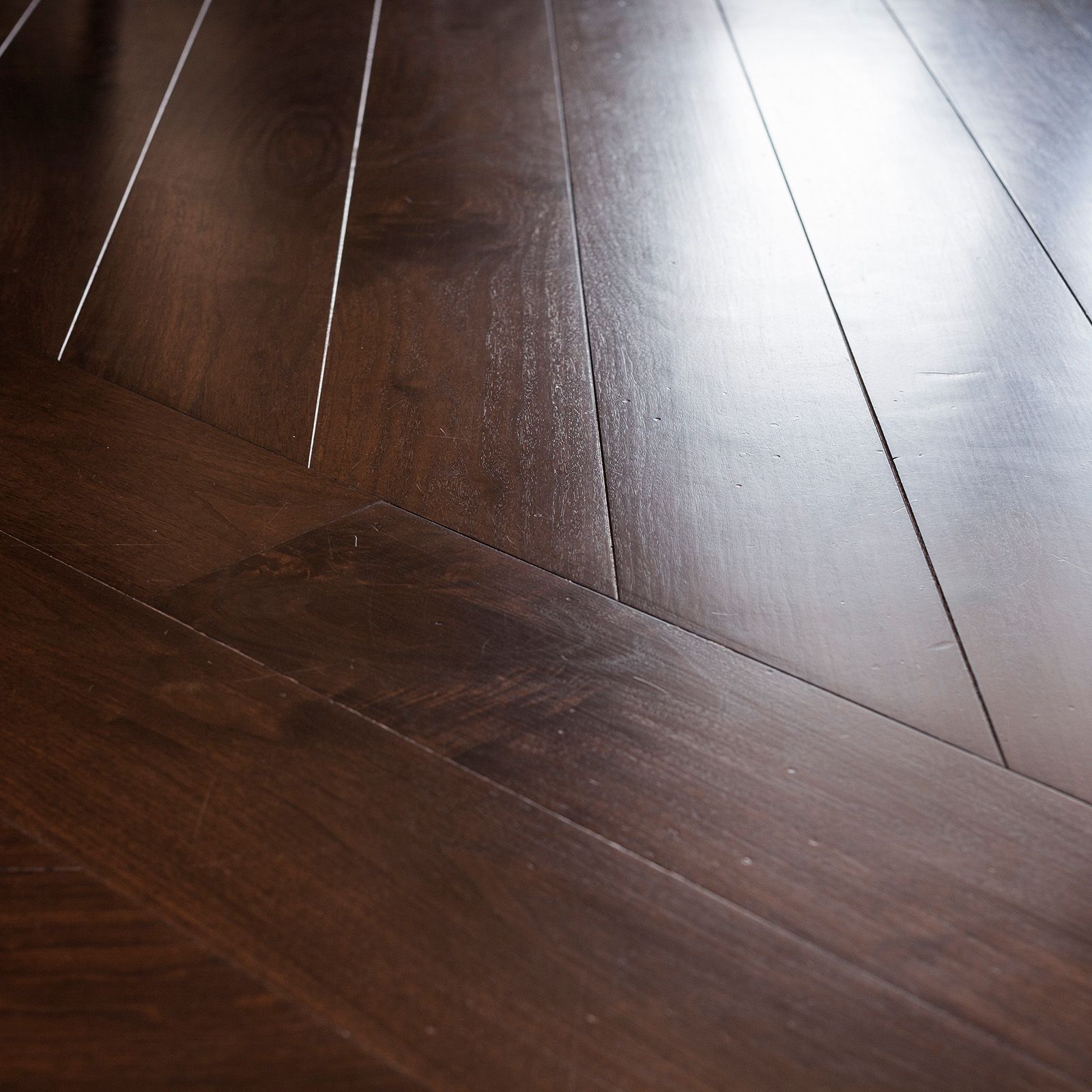 Floor:American Walnut Select Grade, finished with Espresso Brown Satin Poly, in a bespoke pattern predominantly using 10” (25 cm) fixed widths.